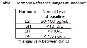 Blood tests: these tests confirm that you are not pregnant and record your FSH, LH, E2, and P4 levels. Though each clinic has their own reference ranges, see Table 3 for average baseline hormone levels.